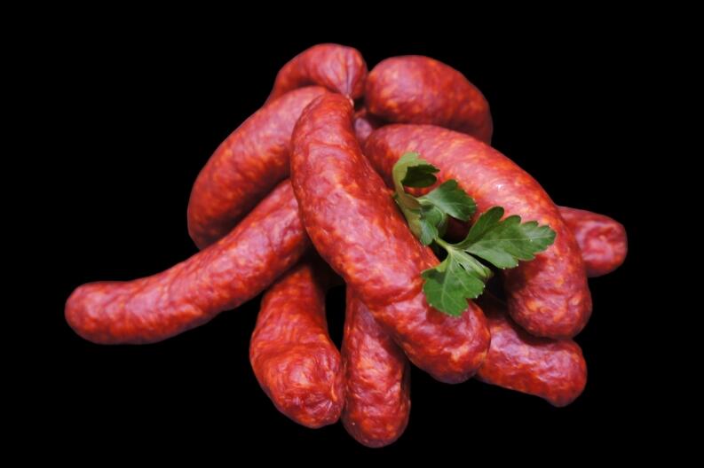 Das Schweinefleisch wird durch den Wolf gelassen , mit feinen Gewürzen , Pökelsalz gewürzt. Diese Rohmasse wird in Schweinsdärmen gefüllt und eine Nacht im Kaltrauch der aus feinem Buchenholz besteht goldgelb geräuchert.